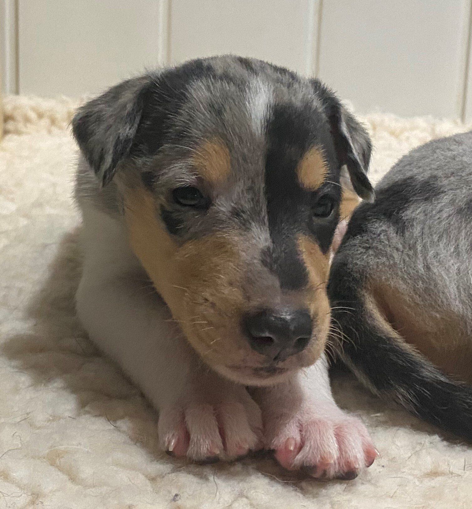 6 Jungs 2 MädelsBluemerle 4/0Tricolor 2/2Da der erste Tricobub einen Drachen als Zeichnung hat und der 3. geborene ein Herz nennen wir sie unsere Drachenkinder somit ist der Wurfname:Dragonhearts Litter